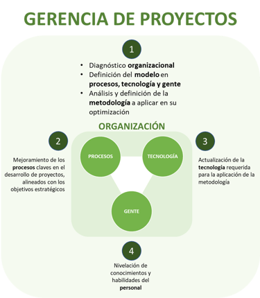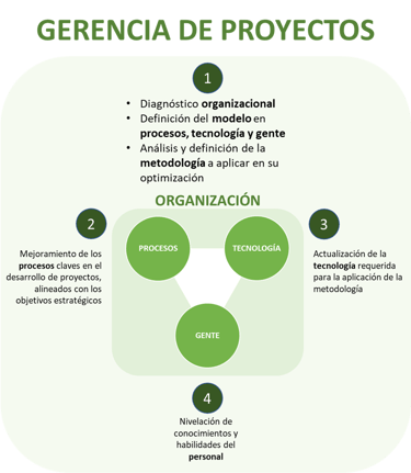 Nuestro apoyo a la gerencia del proyecto y a su equipo de trabajo radica en concretar y ejecutar acciones que cierren brechas entre las mejores prácticas de desempeño en gerencia de proyectos y las desarrolladas por su organización.