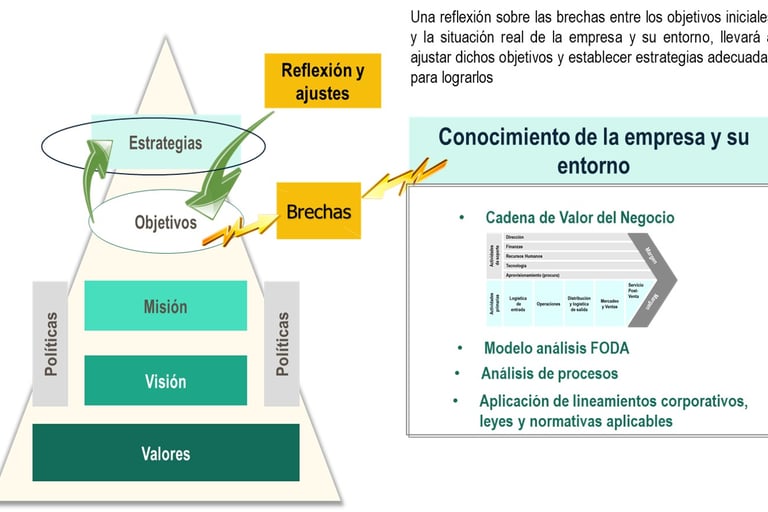 Sin embargo, es fundamental conocer a fondo su empresa y su entorno, por lo que en primer lugar se debe definir su Cadena de Valor, la secuencia en la cual se ejecutan los procesos de una organización, con el propósito de generar los productos que agregan valor a los clientes. Igualmente importante es conocer los procesos en detalle, con sus proveedores, insumos, recursos, productos, clientes y el entorno en que se manejan. Con esta información podemos elaborar más eficazmente el FODA o DAFO, que pretende establecer las Fortalezas y Debilidades de la empresa ante un entorno con Oportunidades y Amenazas. Y las combinaciones FO, FA, DO, DA nos proveerán una primera aproximación de los temas estratégicos y objetivos que se requieren, todo con base en la aplicación de lineamientos corporativos, leyes y normativas aplicables.